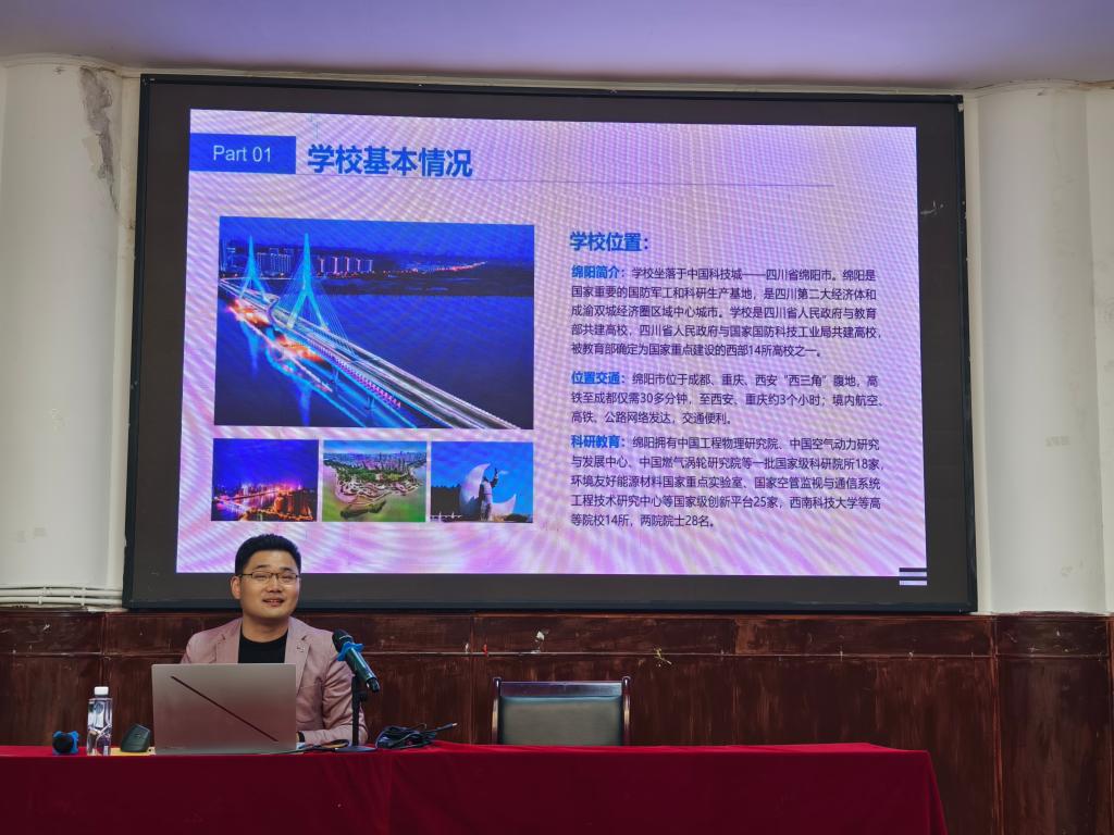 活动伊始,陈春坛主任对陈涛教授的到来表示热烈欢迎。随后,陈涛教授详细介绍了西南科技大学与国防科技学院的整体概况、团队力量、科研平台与招生政策。针对招生细则,陈教授解读了招生方向、考试科目及调剂政策,重点阐述了相关专业的特色优势及完善的奖助体系。